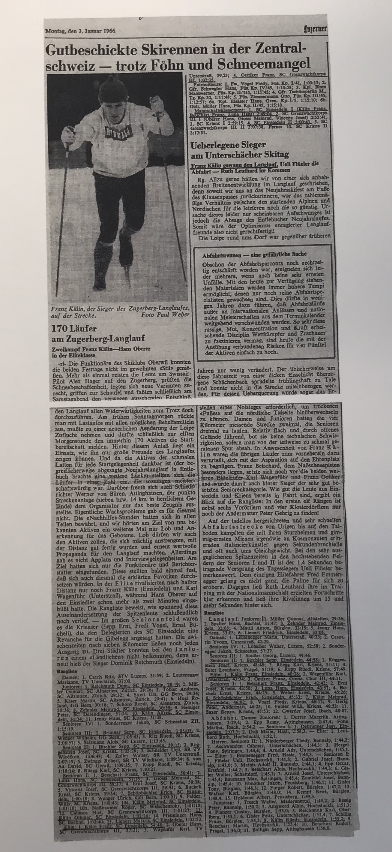 Zugerberg Langlauf, Zeitungsbericht der Luzerner Zeitung vom 3. Januar 1966.